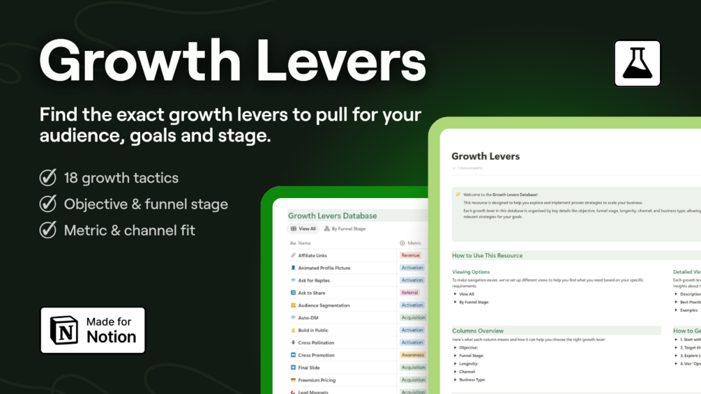 This Notion database gives you a library of growth tactics used by real businesses, sorted to match your goals, stage, and model.