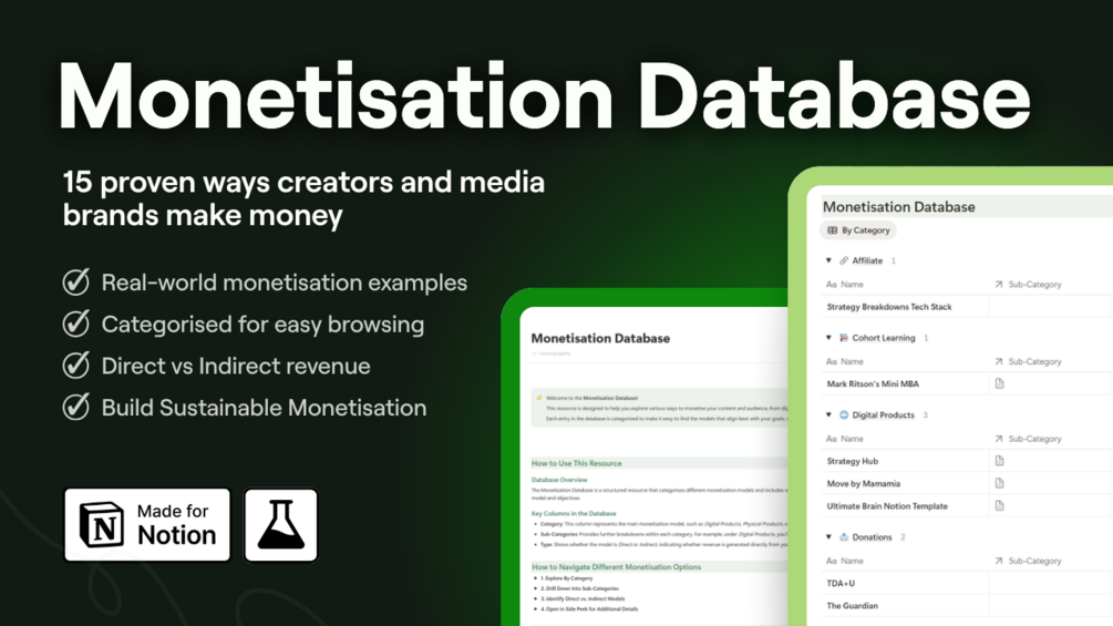 This Notion database gives you 15 real monetisation examples, organised by category, subcategory, and type, so you can confidently explore your next revenue move.